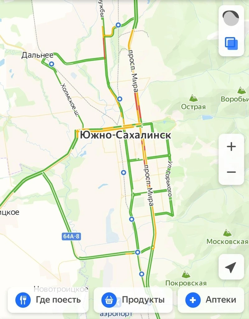 Согласно сервису «Яндекс.Пробки», в настоящее время многокилометровые заторы образовались буквально по всему проспекту Мира в обе стороны. Машины стоят также на улицах Ленина, Сахалинская, Железнодорожная и Комсомольская. На остальных дорогах проезд затруднен только на небольших участках.