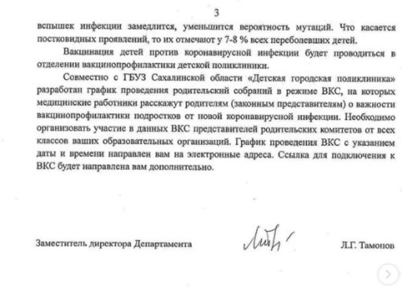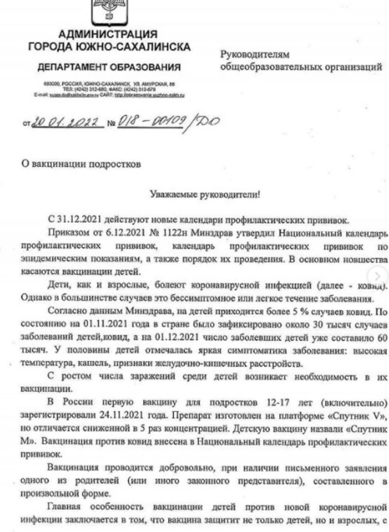 Островитян данное письмо ввело в замешательство. Они сомневались, официальный документ это или фейк, а также начали переживать, что вакцинацию для детей пытаются сделать обязательной. В администрации Южно-Сахалинска прояснили ситуацию.