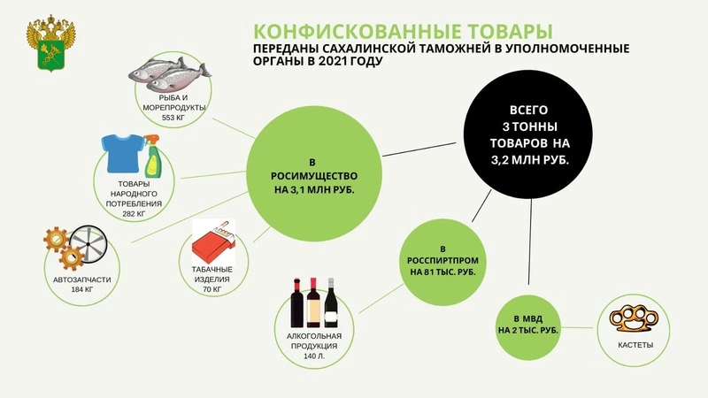 Большую часть товаров на сумму 3,1 млн рублей таможенники передали в Росимущество. Среди них — 553 кг водных биологических ресурсов. Немалую часть также составляют товары народного потребления, автозапчасти и табачная продукция. Все предметы пытались незаконно ввезти на территорию Российской Федерации.
