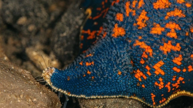 «Гребешковая патирия. Красивая и самая распространенная морская звезда побережий Японского и Желтого морей. На севере она встречается в заливе Анива Охотского моря и на южных Курильских островах. Окраска верхней спинной стороны тела патирий меняется от нежно-голубого до темно-синего цвета с затейливыми узорами из оранжевых или алых пятен», — говорится в сообщении Instagram-аккаунта @moneron.island.