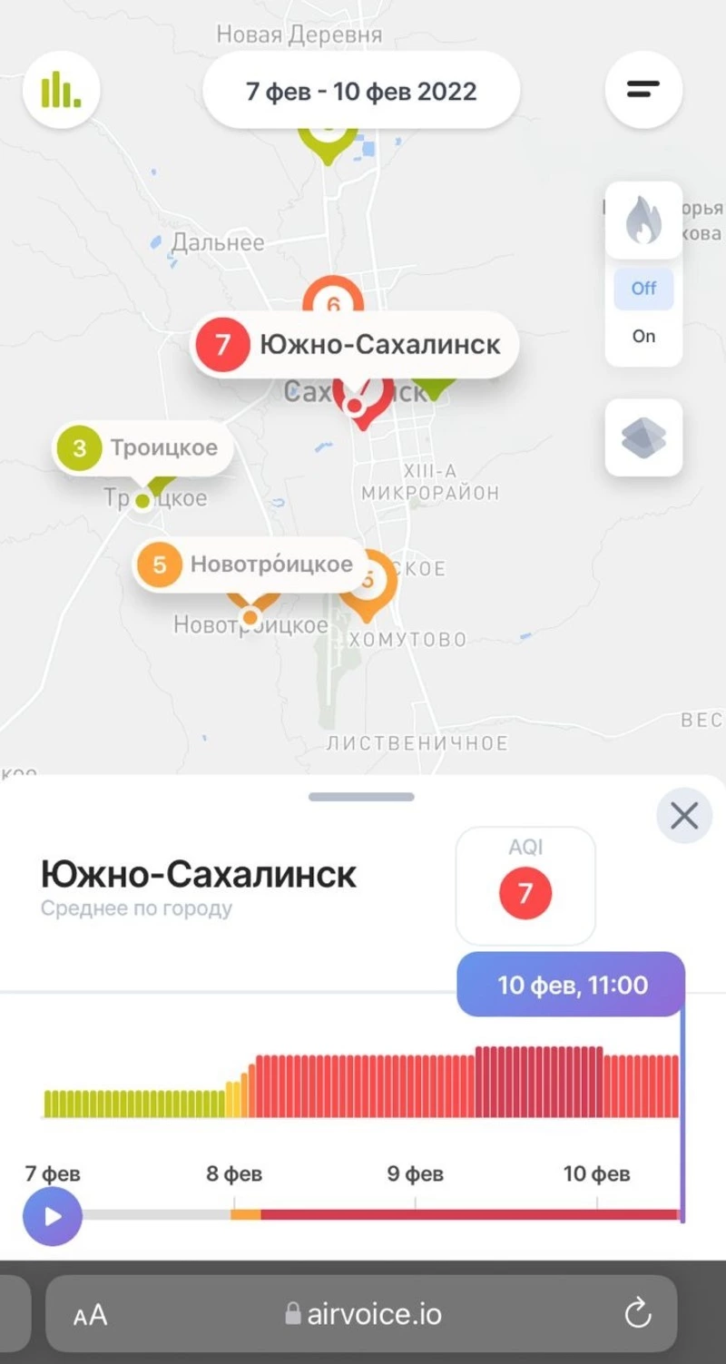 Согласно данным сервиса мониторинга воздуха CityAir, качество воздуха в Южно-Сахалинске сегодня оценивается в 7 баллов из 10. Показатели ухудшились еще 8 февраля.