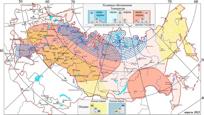 Температура выше нормы, по словам Вильфанда, ожидается на Европейской территории России, Урале, а также в Западной Сибири, на юге Дальнего Востока. Сухим будет апрель на юге Центрального федерального округа (Тамбовской, Воронежской, Белгородской области), а также в Алтайском крае, Кемеровской области, в Забайкалье и на юге ДФО — в Хабаровском и Приморском краях, и в Амурской области. В этих субъектах вероятна ранняя пожароопасность.