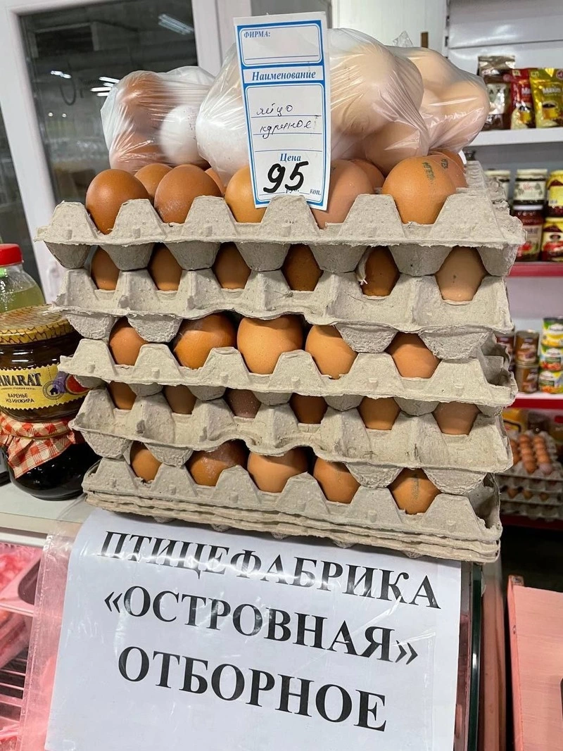 Блогер заглянул в популярные торговые сети, социальный магазин, а также в фирменный отдел сахалинской птицефабрики «Островная». Он выяснил, что яиц в достатке, но цена на привозной и местный продукт сильно отличается.