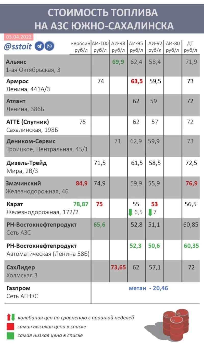 Сильно подешевело на этой неделе топливо у АЗС «Карат» на Железнодорожной, 172/2. АИ-95 и АИ-92 там скинули по 6,5 и 7 рублей соответственно. При этом АИ-92 и АИ-100 на этой заправке остаются самыми дорогими в городе. АИ-95 дороже всего продает «Армрос», керосин и дизельное топливо — «Змачинский», АИ-98 — «СахЛидер». В остальном все стабильно.