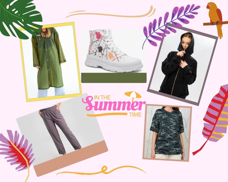 В мужской аутфит вошли камуфляжные бриджи, простая белая футболка, толстовка на молнии, дышащие кроссовки с резиновой подошвой и желтый плащ-дождевик. А теперь обо всем по порядку:
