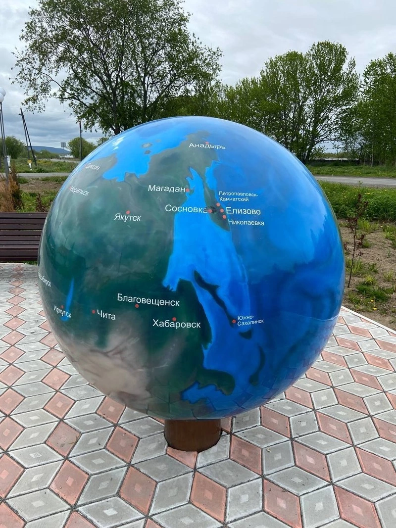 Фотографии с «косячным» памятником опубликовал в своем Telegram-канале сахалинский гид Федор Поволкович. Он уточнил, что шар этот расположен в селе Николаевка на Камчатке.