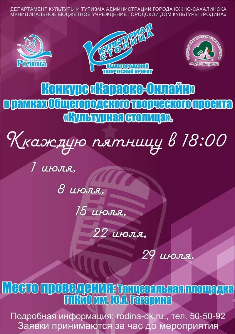 Конкурс «Караоке-Онлайн» будет проходить каждую пятницу начиная с 1 июля 2022 года, на танцевальной площадке в парке культуры и отдыха им. Ю. А. Гагарина в островной столице. Старт мероприятия – в 18:00. Принять участие в музыкальном состязании смогут все любители песен и музыки. Заявки на участие будут приниматься за час до начала конкурса.