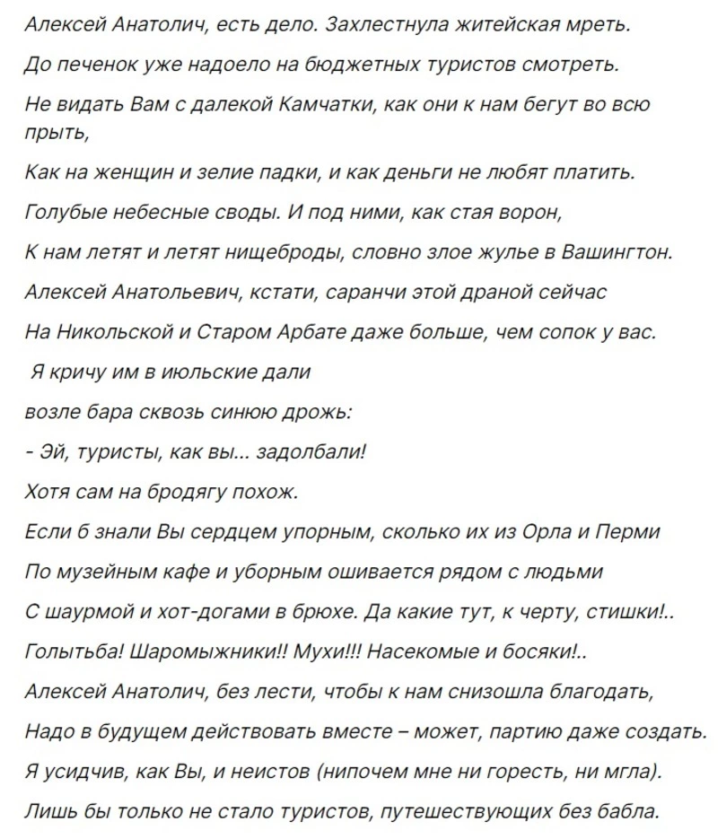 В ироничной форме корреспондент поддержал главу Минприроды, подчеркнув, что даже готов создать новую партию рифмованных строк, лишь бы «не стало туристов, путешествующих без бабла». Громкие строки автора опубликованы на сайте издания «Кам 24». Sakh.online публикует произведение журналиста целиком.