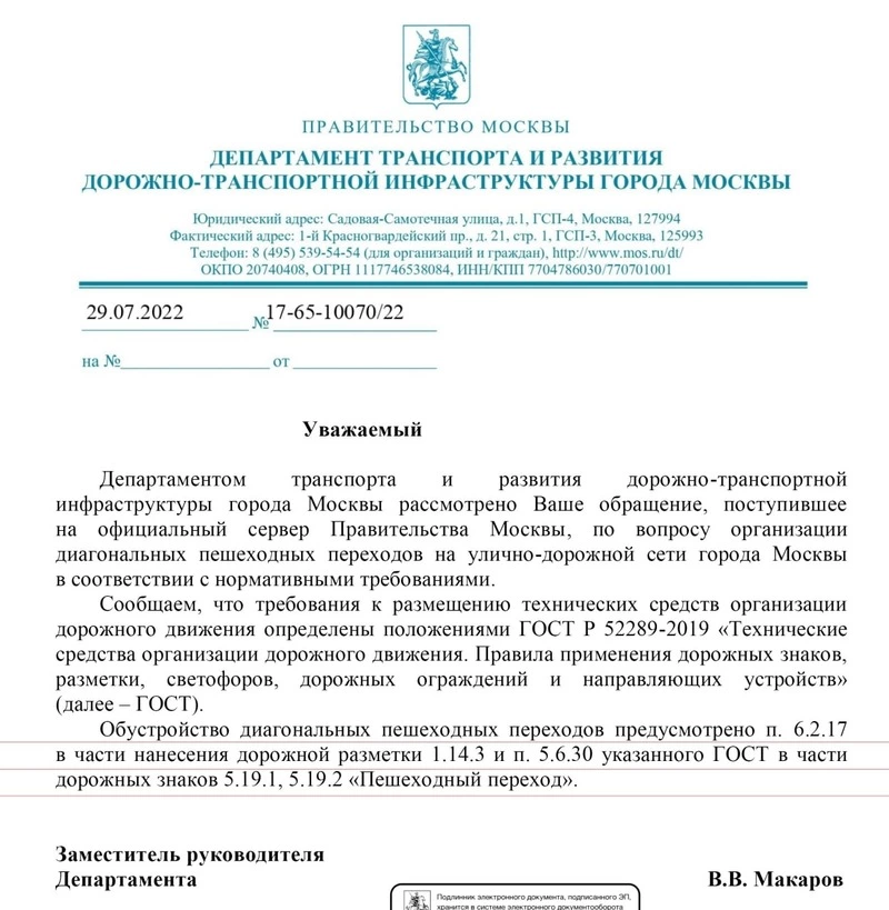 Сегодня в этом же паблике появился очередной пост на тему диагональных пешеходных переходов. Авторы не поленились и, помимо того, что насчитали 41 действующий переход в Москве, обратились с запросом в столичный департамент. В полученном официальном ответе говорится, что департамент действует в связи с требованиями ГОСТа.
