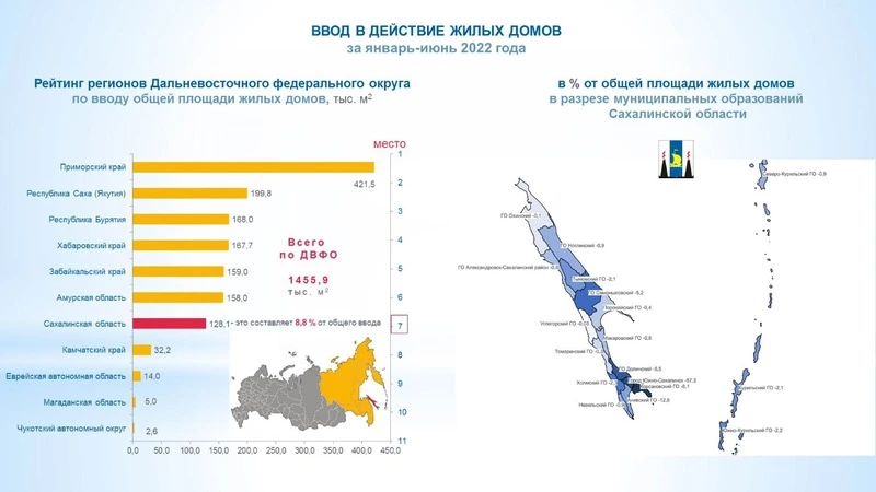 За первые шесть месяцев 2022 года новые жилые дома были сданы во всех муниципалитетах области. Лидером по этому показателю является Южно-Сахалинск — 57,3% жилых домов об общего количество введенного в эксплуатацию жилья. В Аниве этот показатель составляет 12,6%, а в Корсакове — 6,1.