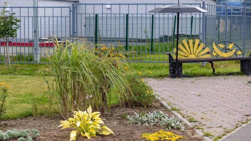 Представитель ландшафтной мастерской Анастасия Бурик рассказала, что в создании композиции главный акцент делается на использовании ярких оттенков. В композицию вошли кустарники с желтыми листьями – спиреи, пузыреплодник и другие.