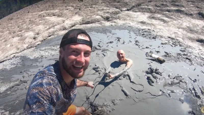 Вооружившись бутылками, островитяне потопали к «жерлу» вулкана собирать грязь. Затем один из товарищей блогера пошел нырять, а сам Максим решил его подстраховать. После этого островитянин умыл свое лицо грязью.