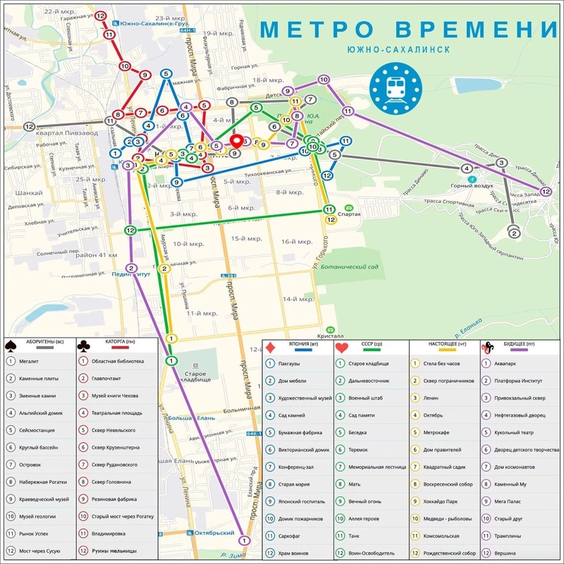 С помощью «Метро времени» жители и гости Южно-Сахалинска могут с интересом и пользой провести время, ближе познакомиться с городом, его памятными местами и историей. Квест заключается в следующем: на карте сахалинской столицы расположены 72 точки геолокации, которые и являются станциями метро. Если приблизиться к какой-то из станций, всплывает задание, за выполнение которого игрок получает бонусные секунды. За день игроку нужно пройти 12 станций и решить 12 заданий, а на следующий день открывается новая ветка метро. Каждая из них посвящена отдельной теме, связанной с историей области и города.