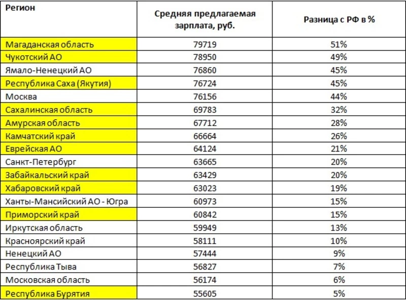 Специалисты службы исследований hh.ru проанализировали, как средние предлагаемые зарплаты в регионах отличаются от показателя по России в целом. Выяснилось, что жители ДФО получают за свой труд на 18% выше средних показателей по стране. Все дальневосточные регионы вошли в первую двадцатку по уровню средней предлагаемой зарплаты в РФ.