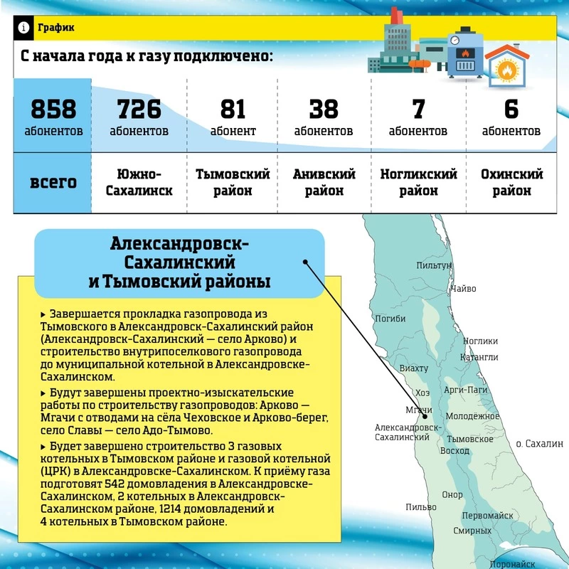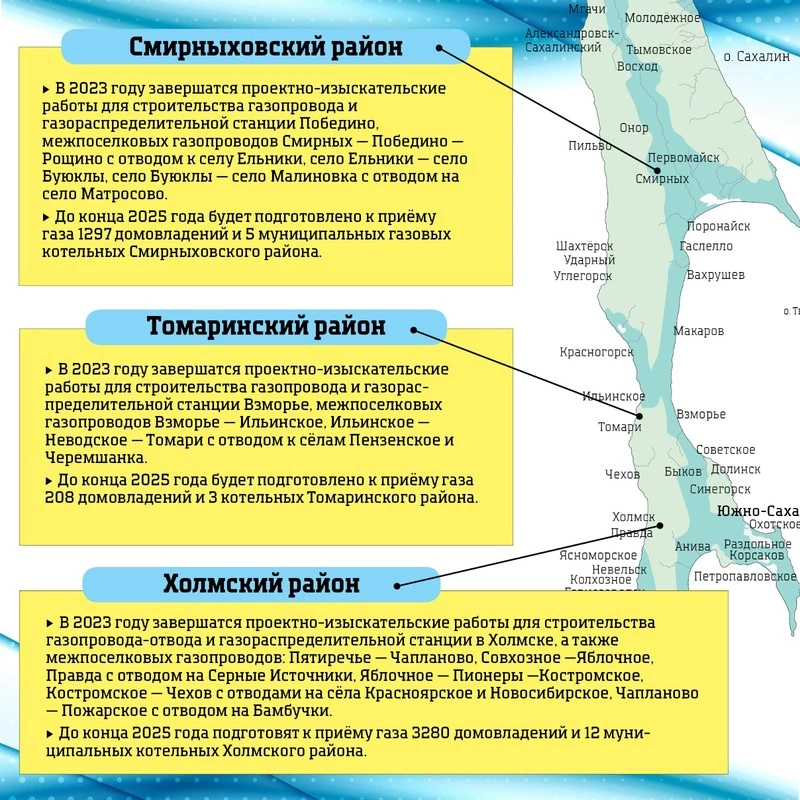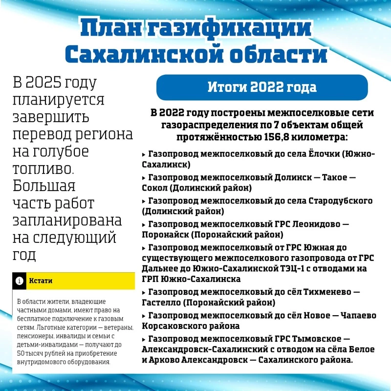 Правительство Сахалинской области планирует до 2025 года полностью газифицировать регион. При этом, большую часть муниципалитетов переведут на голубое топливо уже в 2023 году. О том, как будут проходить работы по переходу на газ, а также об итогах 2022 года — в карточках Sakh.online.