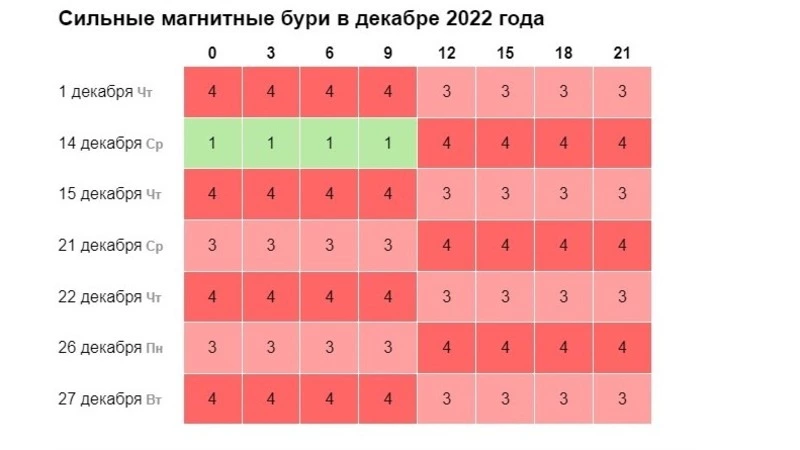 По данным my-calend.ru, наиболее опасными днями в последнем месяце этого года будут 1, 14, 15, 21, 22, 26 и 27 декабря. В эти сутки прогнозируются магнитные бури в четыре балла.