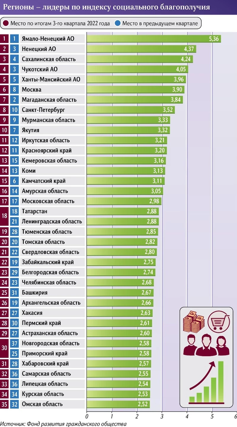 По данным фонда развития гражданского общества за III квартал Сахалинская область имеет следующие показатели: среднемесячная зарплата — 102 797 рублей, расчетная стоимость жизни — 24 259 рублей, индекс социального благополучия — 4,24. Эти данные помогли острову возвысится в топе: занять третье место среди 37 регионов. Тем временем Ямало-Ненецкий АО занял первое место, а на втором расположился Ненецкий ОА.