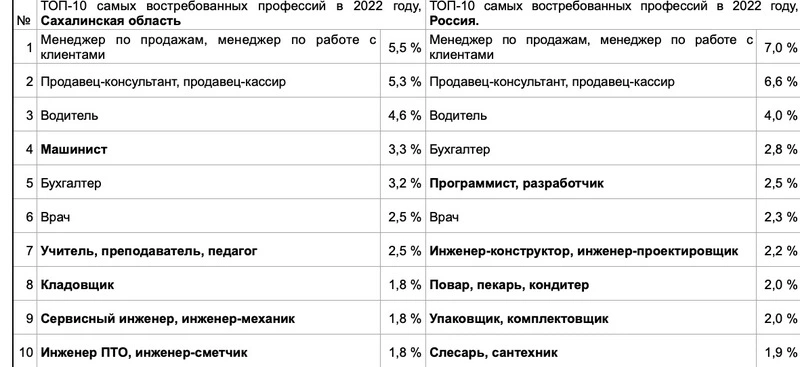 «Интересно, что тройка самых востребованных профессий 2022 года в Сахалинской области совпадает с общероссийской. При этом в сахалинский рейтинг вошли пять профессий, которых нет в общероссийском топе: машинист (4 место), учитель (7 место), кладовщик (8 место), сервисный инженер/инженер-механик (9 место) и инженер ПТО/инженер сметчик (10 место). Зато в рейтинге страны присутствуют профессии программиста/разработчика, инженера-конструктора, повара, упаковщика/комплектовщика и слесаря, которых нет в региональной «десятке», — рассказала аналитик hh.ru на Дальнем Востоке Елизавета Илюшина.