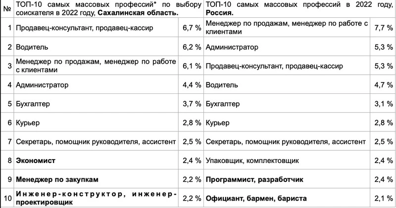Специалисты онлайн-платформы также выяснили профессии, среди которых сахалинцы искали работу. Как оказалось, рейтинг совпал с общероссийским. В то же время, в отличие от регионов в центральной и средней полосе России, в островной топ вошли экономист, менеджер по закупкам, инженер-конструктор/инженер-проектировщик.