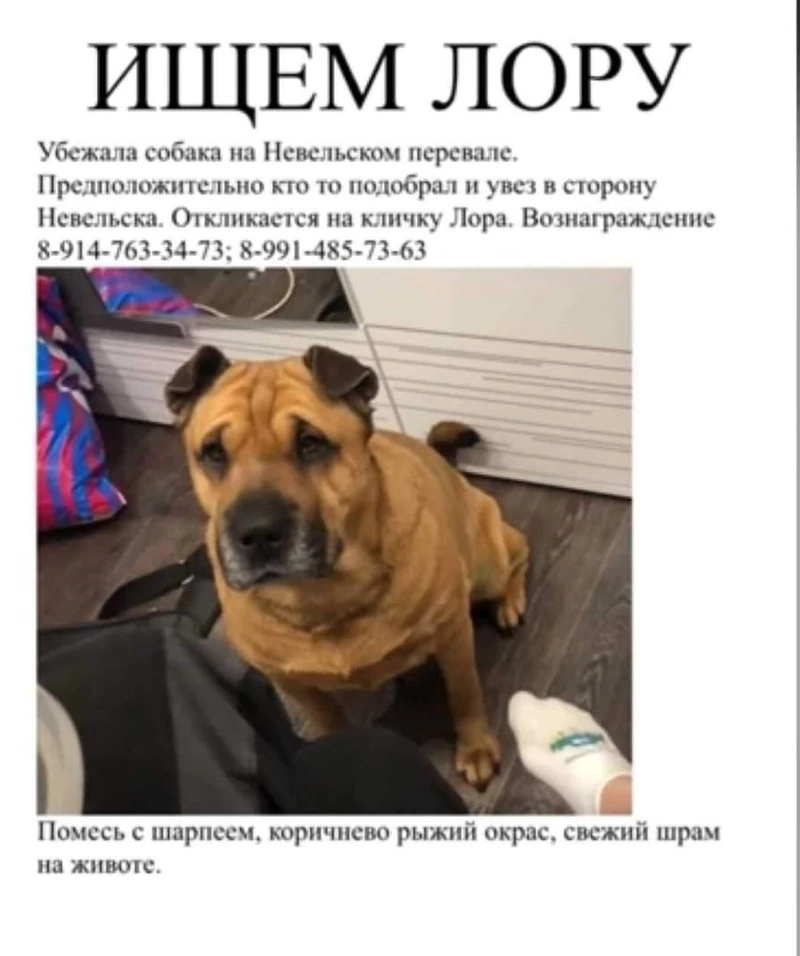 Так, пост с информацией о потерянном животном появился в социальной сети Instagram*. По словам хозяев, собака убежала от владельца на Невельском перевале. Как предполагают сахалинцы, вероятнее всего, кто-то подобрал питомца и увез в сторону Невельска. Животное коричнево-рыжего окраса, беспородное (помесь с шарпеем). Отзывается на кличку Лора. Из особенностей — свежий шрам на животе.