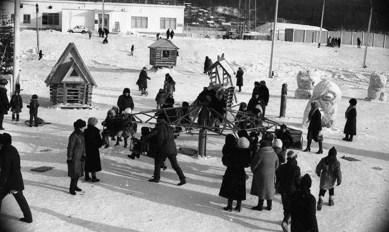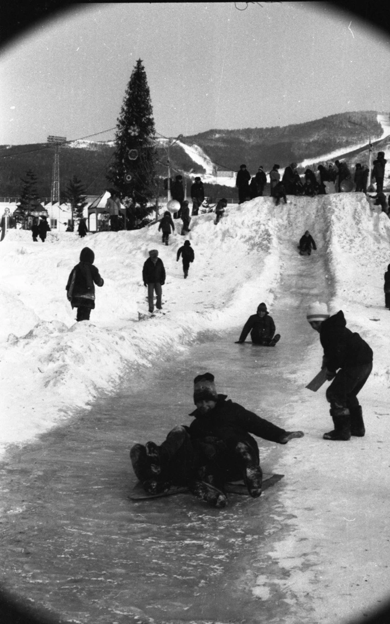 Главная детская забава зимой — катание с ледяной горки. В данном случае горка деревянная, но с покрытием из льда. Фотограф Борис Кречетов запечатлел радостных катающихся детей в 1967 году в Южно-Сахалинске.