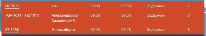 По данным онлайн-табло в аэропорту Хомутово, самолет авиакомпании «Аврора», следующий маршрутом Южно-Сахалинск — Оха, должен был вылететь на север в 9:00 по местному времени. Рейс сначала задержали до 9:30, а потом вновь отложили отправку на неизвестное время.