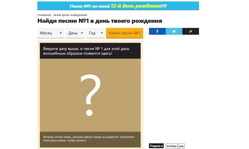 Проект Find the #1 Song on the Day You Were Born уже получил большой отклик во всем мире. Люди с энтузиазмом пользуются программой и делятся с ней со своими друзьями. Это неудивительно, ведь многим интересно узнать, какая песня гремела по всем радиостанциям в момент, когда пользователь только появился на свет. Для того, чтобы определить песню, необходимо ввести дату своего рождения. После этого система самостоятельно отберет композицию, которая находилась на пике популярности в день вашего рождения, и даже покажет клип к песне. Однако у приложения есть небольшой минус — сервис берет во внимание только композиции западных исполнителей.