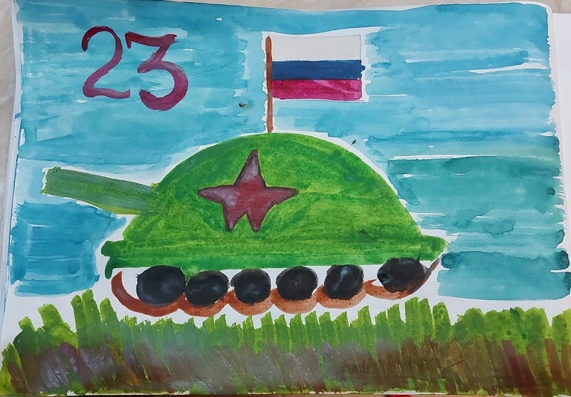 Шестилетний мальчик Иван Щеглов тоже поделился тематической иллюстрацией. Однако, решил скреативить и украсить свою работу особой техникой — коллаж. Помимо этого, он оставил небольшое послание бойцам, которые участвуют в спецоперации и сейчас находятся на передовой.