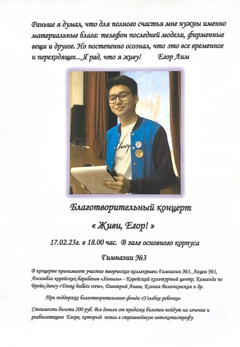 Поддержать семью и самого Егора может каждый неравнодушный житель области. Мероприятие состоится, в пятницу, 17 февраля, в 18:00 в зале основного корпуса МАОУ «Гимназия №3», по адресу: улица Детская, 8. Стоимость билета — 200 рублей, купить его можно на месте, с помощью QR-кода, а также будет стоять урна для сбора наличных средств. Вырученные деньги с пожеланиями скорейшего выздоровления передадут семье пострадавшего.