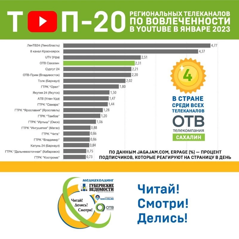 Так, телеканал «ОТВ Сахалин» медиахолдинга «Губернские ведомости» занял четвертое место во всероссийском рейтинге. Показатель вовлеченности YouTube-аудитории составил 2,31%. Первые три места заняли каналы «ЛенТВ24» из Ленинградской области, «8 канал» Красноярска и «UTV» Уфы с показателями 4,77%, 4,37% и 2,51% соответственно.