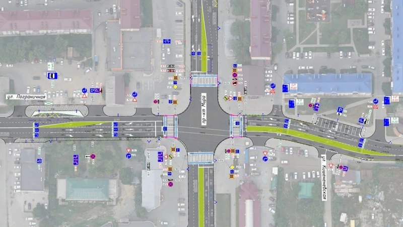 Чтобы сохранить циркуляцию в северном направлении, на повороте с Пограничной специалисты предложили сделать переразметку и светофорную стрелку. В основном полосы останутся по 3,5 метра, пара полос составит по 3,25 метра. Однако, чтобы обеспечить безопасность на данном пересечении, необходимо сузить полосы до 3 метров и установить островки безопасности. Урбанист подчеркнул, что это никак не повлияет на пропускную способность перекрестка.