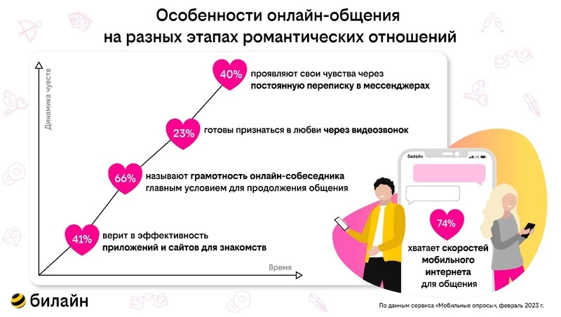 После того, как отношения прояснились, самыми популярными способами демонстрации чувств любимому человеку стали постоянная переписка в мессенджерах (40%) и отправка смешных картинок и видеороликов (36%). А молодые люди в возрасте до 24 лет сильнее остальных хотят не только слышать голос своей второй половинки, но и видеть ее лицо и эмоции: они в 1,5 раза чаще звонят по видеосвязи и в 6 раз больше записывают видеообращения, чем в среднем люди других возрастных групп. Это требует качественного мобильного интернета. Согласно полученным результатам, 74% опрошенных хватает скоростей мобильного интернета билайн для онлайн-общения с близкими людьми.
