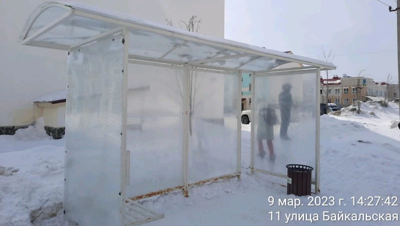 Утром 9 марта в Telegram-канале «НД» опубликовали фотографии разрушенной остановки на улице Байкальской в Дальнем. Жители сообщили, что конструкция пострадала во время непогоды 8 марта. Судя по кадрам, стенку выдавило из основного каркаса и засыпало снегом.