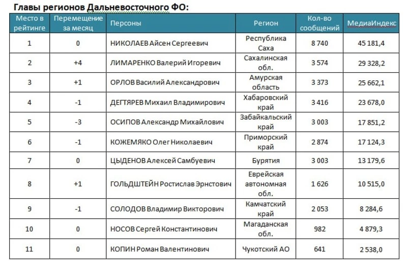 Из 11 позиций Валерий Лимаренко занял почетное второе место в рейтинге на территории ДФО, уступая лишь губернатору Республики Саха Айсену Николаеву. Показатели главы островного региона по количеству сообщений составили 3 574 единицы, а по МедиаИндексу — 29 328,2.