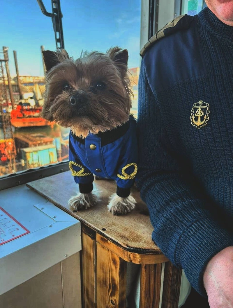 «Собака друг человека? Я вам скажу, что это не только друг человека, но и член экипажа. Йоркширский терьер Геннадий в форме 3ПКМ приехал к нам с инспекцией под чутким руководством капитана. Проверяет вахтенную службу в готовности к рейсу. Это он с виду милое создание, но спуску на судне он никому не дает», — рассказал своим подписчикам блогер.