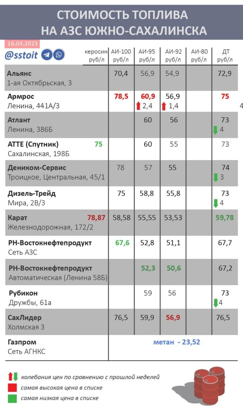 Таблицу с актуальными ценами на автомобильное топливо на АЗС Южно-Сахалинска опубликовали в Telegram-канале «Стоит». Согласно данным ресурса, стоимость дизельного топлива уменьшилась на четырех заправках: у «Атланта» (Ленина, 386б) на 4 рубля — сейчас литр ДТ там отпускают по 73 рубля, у «Деником-Сервис» (Троицкое) на 3 рубля, актуальная стоимость — 74 рубля за литр. Также снижение цен на дизель коснулось «Дизель-Трейд» (Мира, 2в/3) и «Рубикон» (Дружбы, 61а) — там топливо стоит 73 рубля за литр, на 4 рубля дешевле.