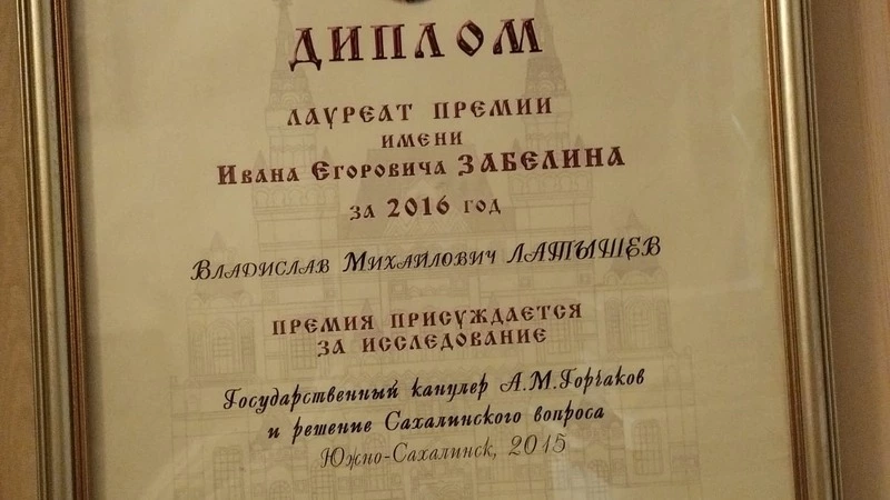 В 2017 году Владислав Михайлович вместе с Галиной Ивановной стал лауреатом премии им. И. Е. Забелина Государственного исторического музея (г. Москва) за издание книги «Государственный канцлер А. М. Горчаков и решение сахалинского вопроса». Вдова ученого, известная сахалинская журналистка Наталия Латышева называет эту награду редкой и обращает внимание на то, что диплом подписали такие люди, как директор государственного исторического музея А. К. Левыкин, директор института российской истории российской академии наук Ю. А. Петров и председатель отдела внешних церковных связей, митрополит Волоколамский Иларион.