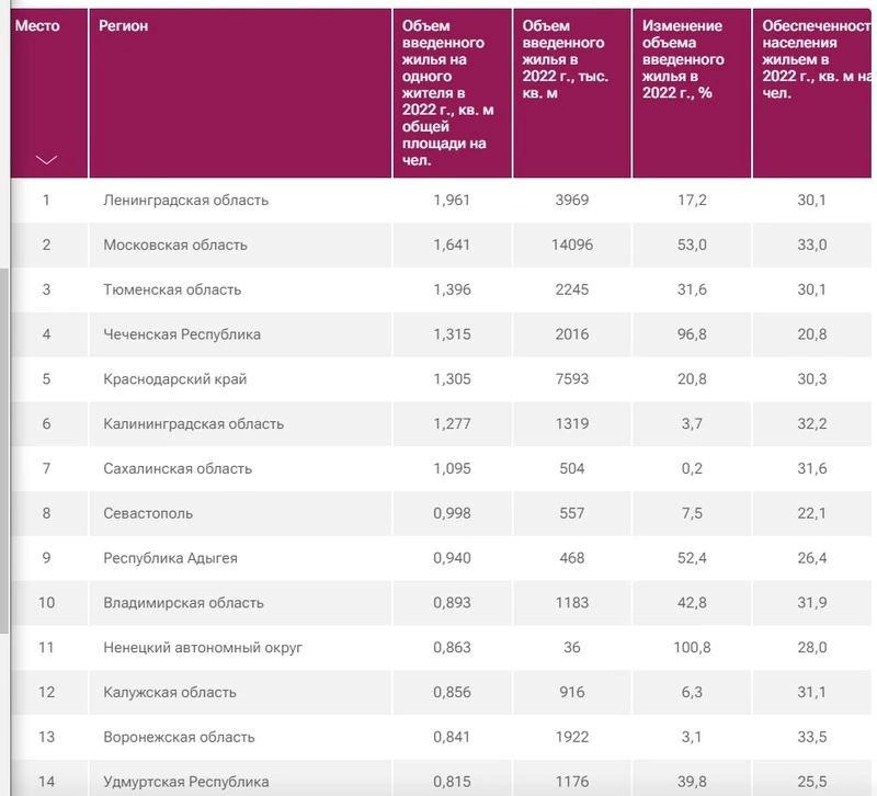 Согласно исследованию, в России для строительной отрасли 2022 год стал годом очередного рекорда. По предварительным данным, в 69 российских регионах наблюдается положительная динамика темпов строительства, а отрицательная — в 16. В 2022 году объем ввода жилья на одного жителя между лидерами и последними регионами в списке рейтинга отличался в десятки раз. Более одного квадратного метра жилья на жителя введено в семи регионах России — в Ленинградской области, Московской области, Тюменской области, Чеченской Республике, Краснодарском крае, Калининградской и Сахалинской областях.