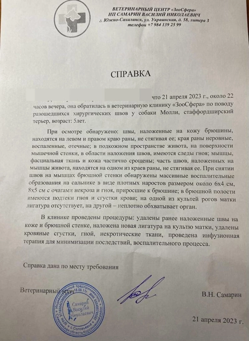 «14 апреля мы решили провести плановую операцию по стерилизации нашей пятилетней собаки Молли. Операция элементарная, которую врачи выполняют очень часто, особенно в этой клинике, так как там стерилизуют не только домашних, но и бездомных животных. Мы подумали, что с его опытом и огромной практикой в этой операции он сделает ее идеально», — рассказала сахалинка.