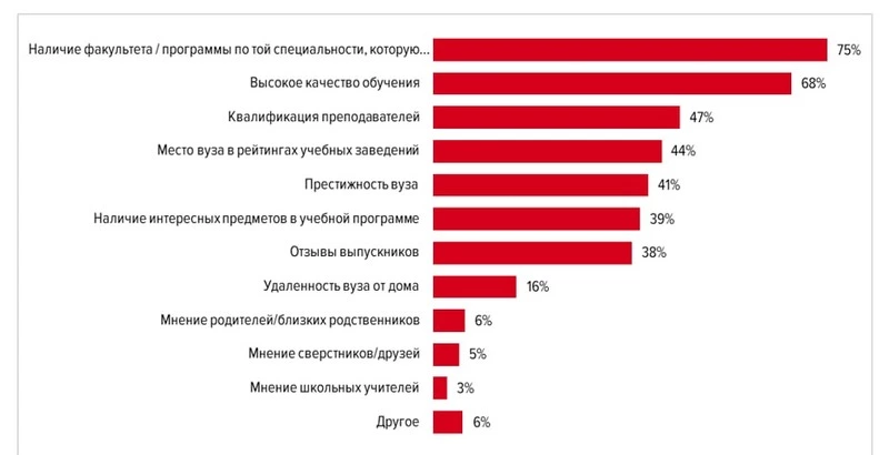 Самым неважным критерием, помимо ответа «Другое», стало мнение учителей (3%). На ступени выше находится мнение друзей и сверстников (5%), и еще более значимым оказалось мнение близких и родителей (6%).