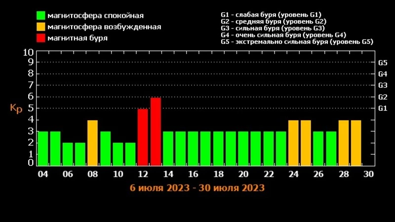 Особое внимание ученые национального управления океанических и атмосферных исследований США (NOAA) уделили геомагнитной активности, которая влияет на магнитное поле Земли. Их прогноз показывает, что с 8 по 9 июля и с 12 по 22 июля ожидается геомагнитная активность. Вероятно, 8 и 12 июля будет наблюдаться незначительная геомагнитная буря класса G1, а уже 13 июля возможны уровни умеренной бури класса G2. Это может привести к некоторым перебоям в работе электромагнитных систем, включая радиосвязь, спутниковые системы и электрические сети.