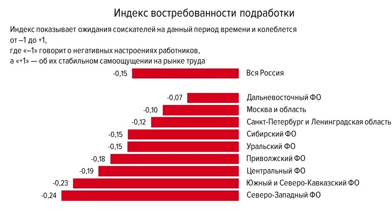 Индекс востребованности подработки по стране вырос на 0,03 пункта и составил 0,18. Меньше других в поиске подработки заинтересованы жители Северо-Западного федерального округа. Однако противоположную ситуацию можно наблюдать в Дальневосточном федеральном округе. Примечательно, что среди представителей различных профессиональных сфер о подработке чаще всего задумываются работники науки и образования.