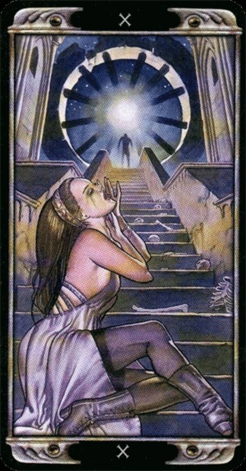 Колесо Фортуны. Карта говорит о переменах, которые неизбежны. Черная полоса сменяется белой, зло уступает место добру, вслед за ночью приходит день. Вселенная постоянно меняется и в то же время остается стабильной. Карта говорит о том, что рано или поздно судьба улыбнется и вам — этого просто нужно дождаться.
