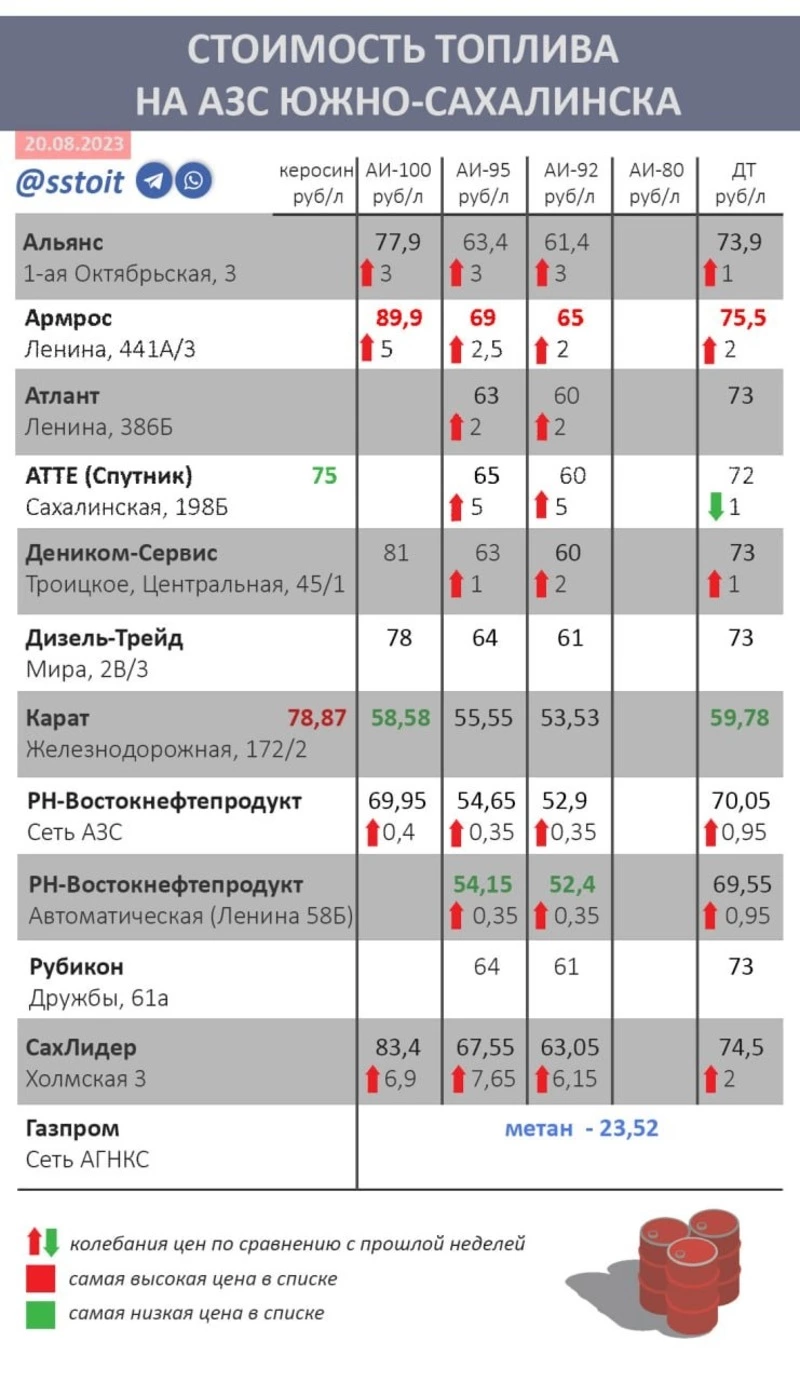 Сегодня, 21 августа, в Telegram-канале «Стоит» опубликовали актуальные цены на дизель. Минимальное повышение стоимости равно 0,35 рубля («РН-Востокнефтепродукт»), максимальное — 7,65 рубля («СахЛидер»). Тем не менее список АЗС, где реализуют самое дешевое и дорогое топливо, не изменился.