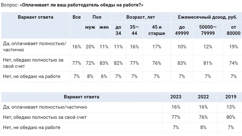 Группа аналитиков сервиса по поиску высокооплачиваемой работы Superjob с 26 июля по 25 августа провела исследование на тему «Обеды на работе». Изначально у респондентов спрашивали, оплачивает (предоставляет) ли им работодатель еду во время трудовых будней. Положительно ответили лишь 16% (как и в 2022 году), а отрицательно — 77%. Чаще всего полную оплату за обед получают сотрудники с доходом от 80 тысяч рублей.