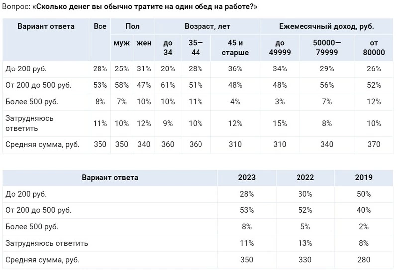 По сравнению с 2019 и 2022 годами, средняя сумма на обед выросла на 70 и 20 рублей соответственно.
