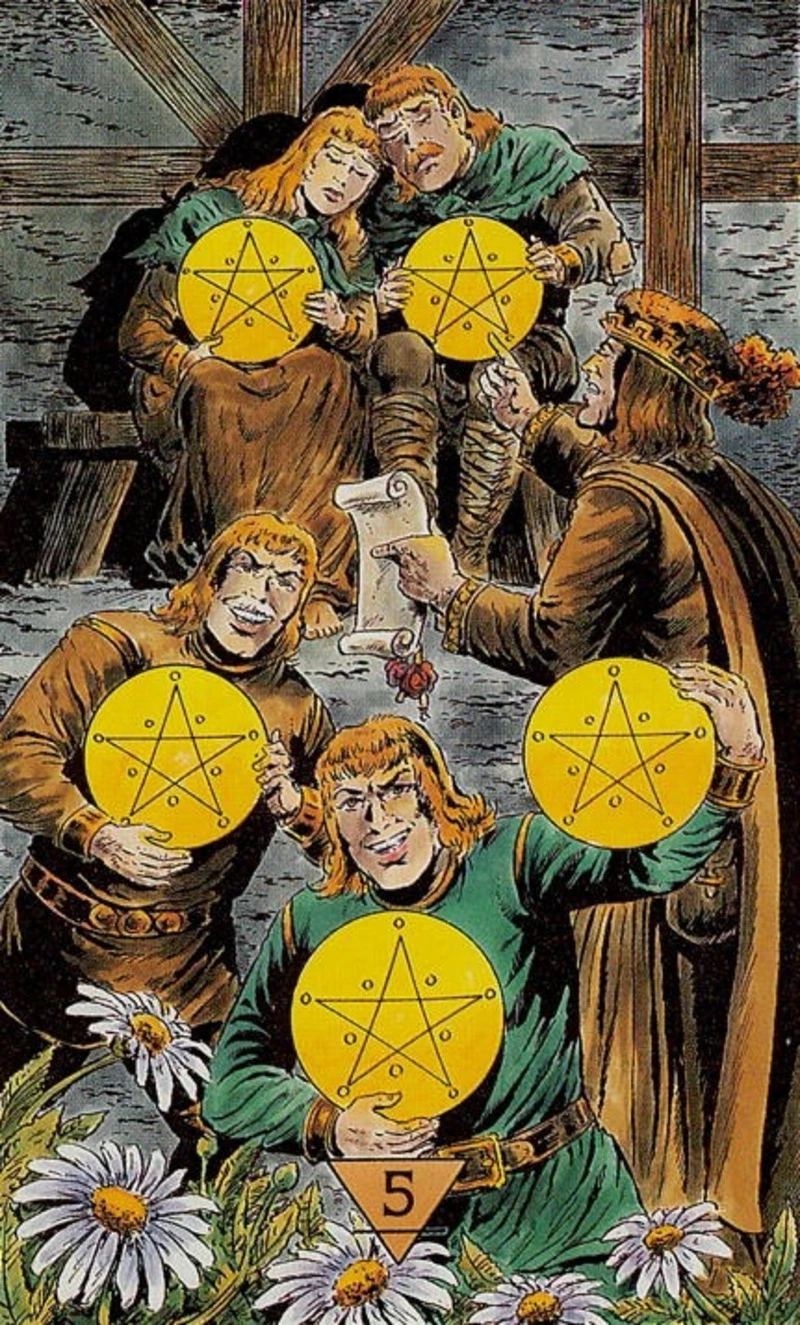 5 Пентаклей. Вы испытываете нехватку наличных, или незапланированные обстоятельства заставляют вас умерить свои запросы. Денег решительно не хватает, поэтому придется перекроить все запасы, иначе в ближайшее время вы не дождетесь пополнения счета. Поэтому откажитесь от всех лишних трат и включите режим бережливого потребления.