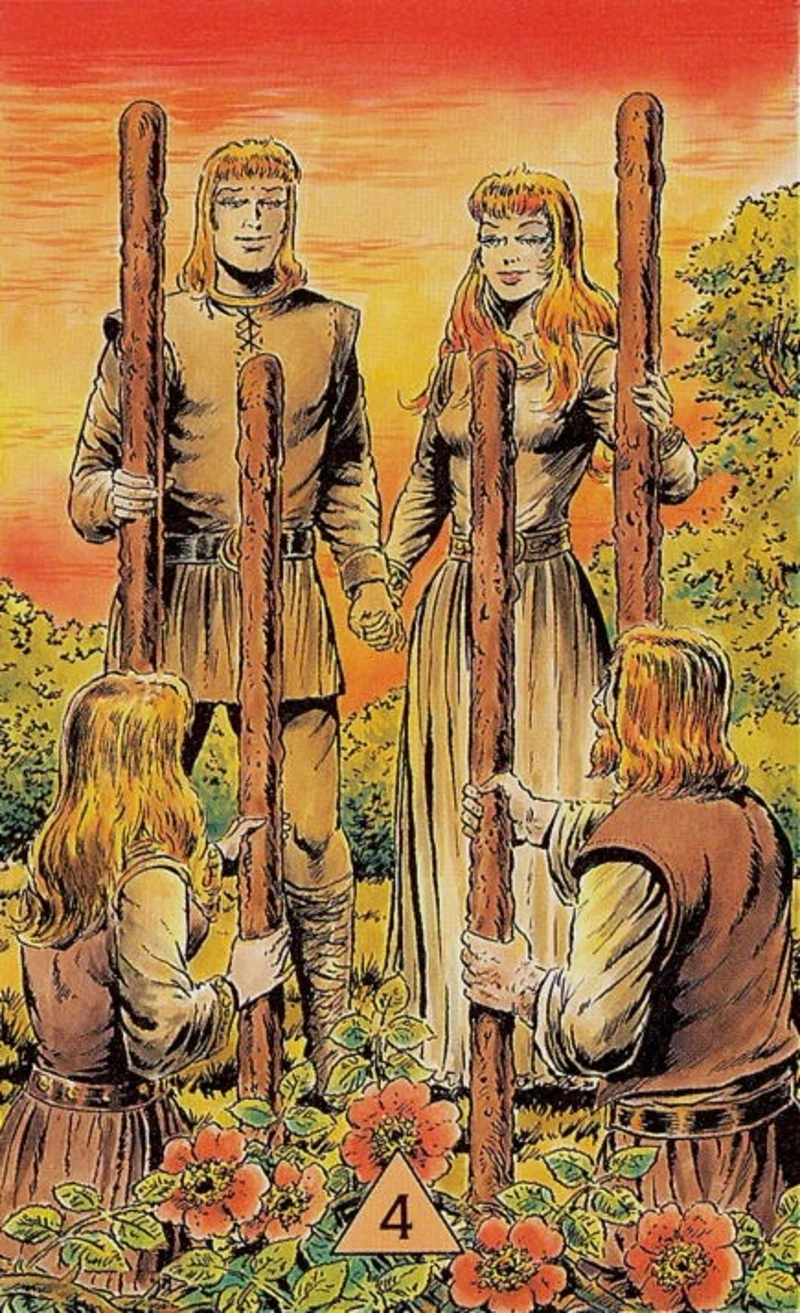 4 Жезлов. Сегодня вы можете выразить себя полностью — не бойтесь неудач и творите. Делайте первые шаги к партнерству, предлагайте необычные решения для рутинных задач и предлагайте всем искать новые подходы. Вы увидите, как дело спорится у вас в руках и оборачивается триумфом.