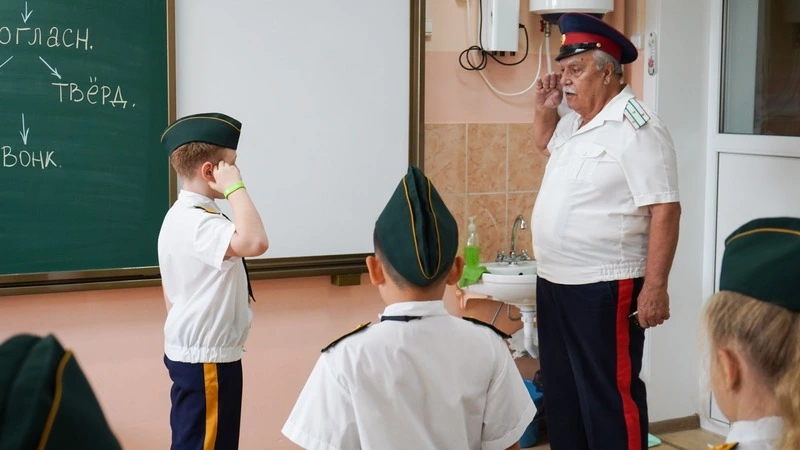В учебном классе чувствуется повышенный уровень дисциплины. Мальчишки отдают честь педагогу, а на головах девчонок белые банты дополняют зеленые пилотки. В характере «вчерашних дошколят» уже прослеживается ответственность и гордость за право быть первым казачьим классом в школе.