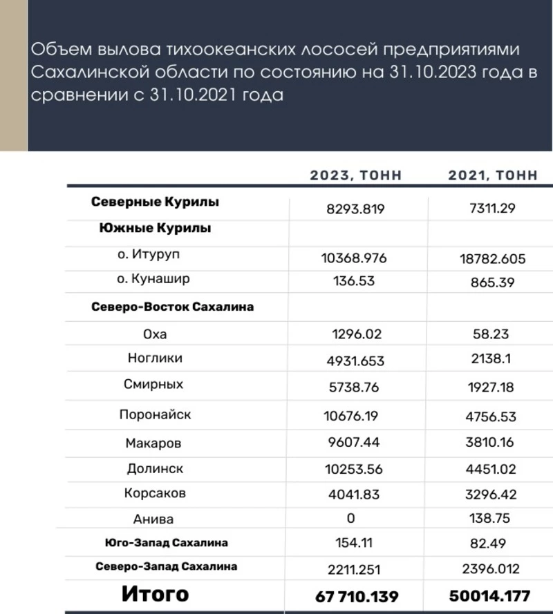Так, по состоянию на 31 октября вылов тихоокеанских лососей составил 67 710,139 тонны. Из них 34 204,063 тонны — горбуша, 31 348,825 — кета, 1347,634 — нерка, 809,617 — кижуч. За неделю островные предприятия добыли 418,456 тонны.